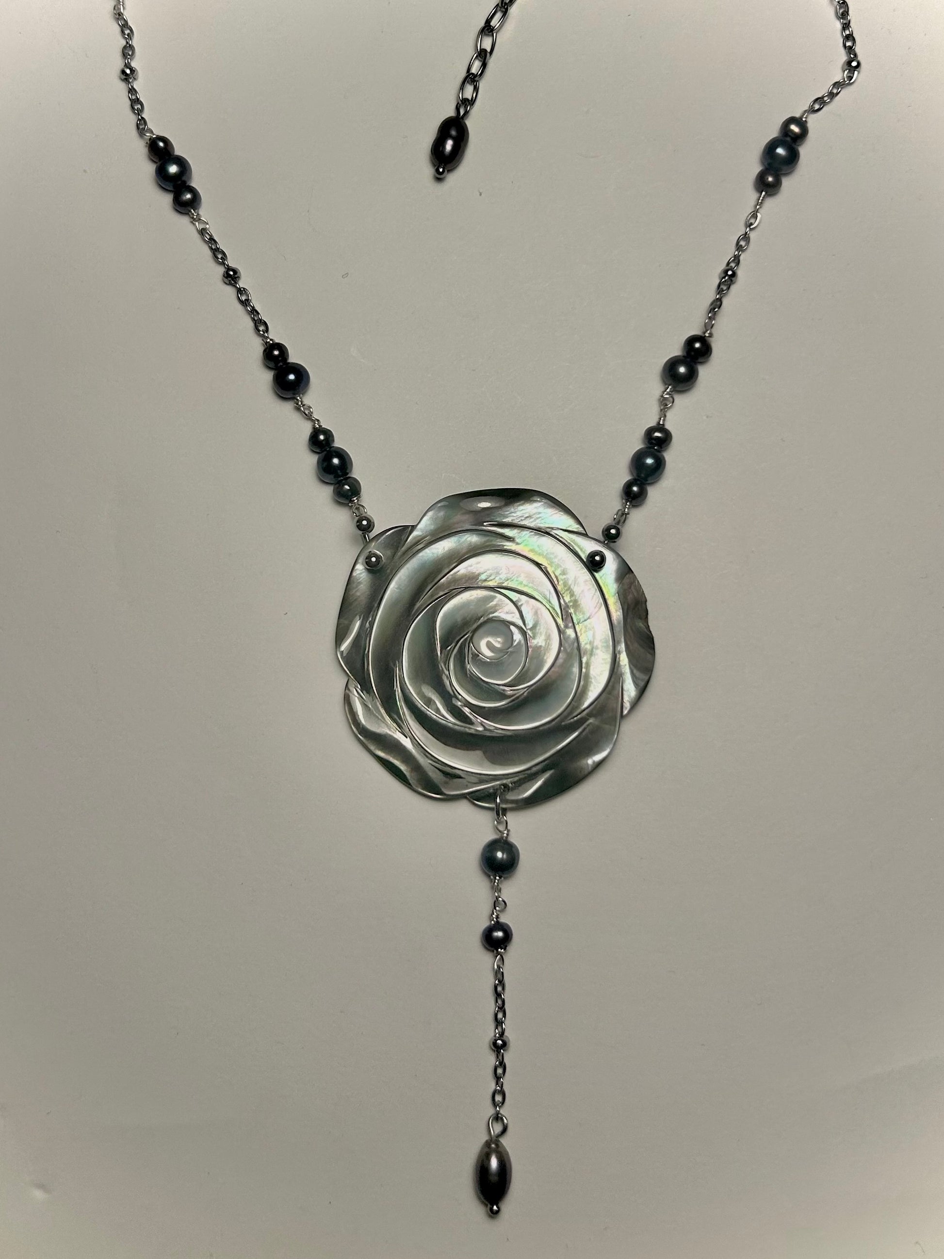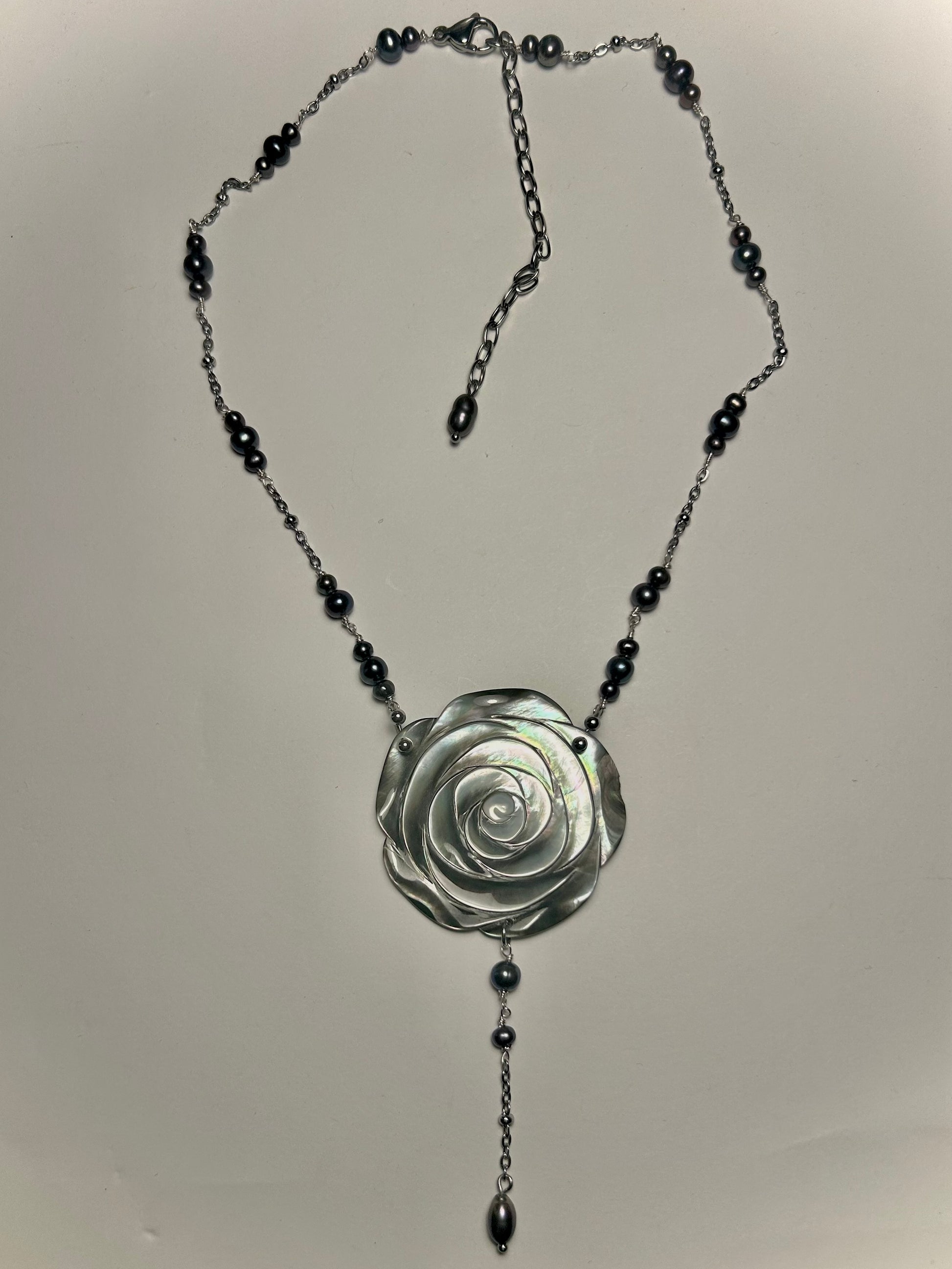 made with mother of pearl/abalone shell pendant, freshwater peacock color pearls, and stainless steel findings